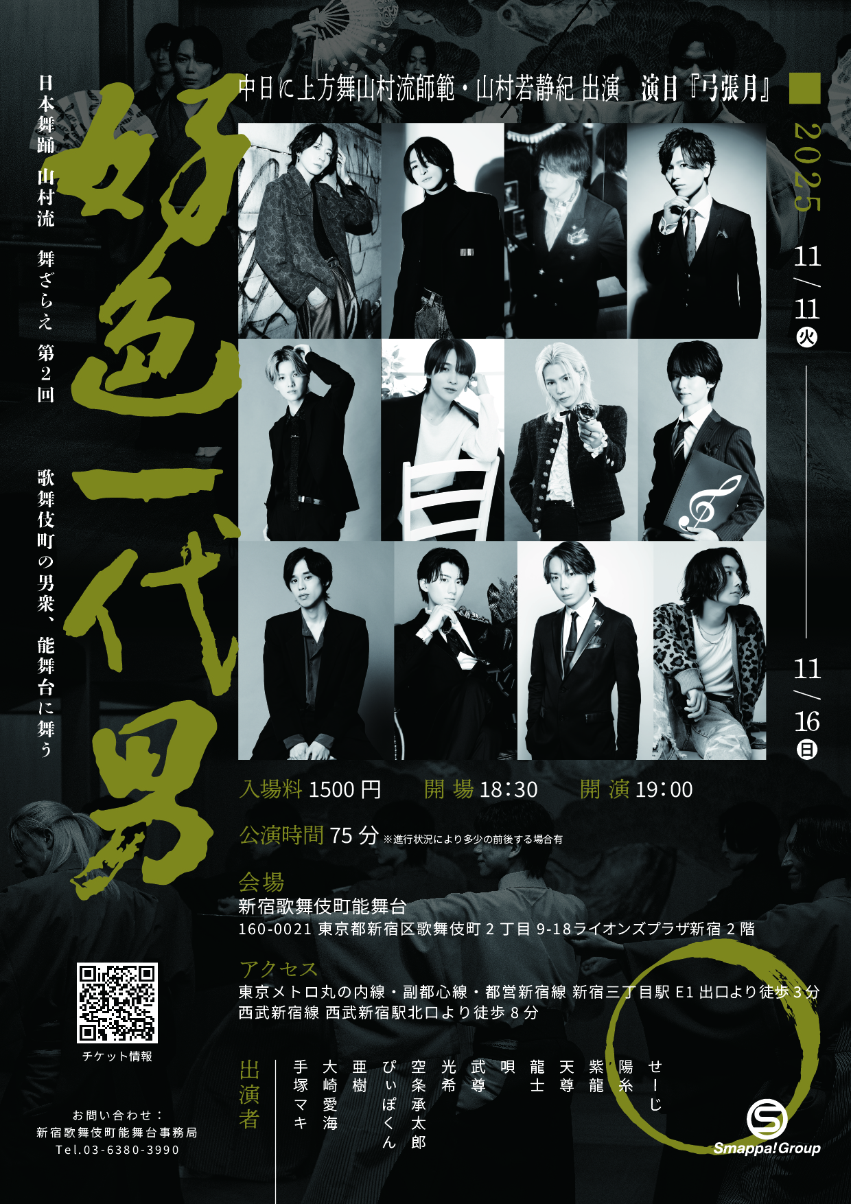 上方舞山村流師範・山村若静紀の指導のもと日本舞踊の稽古を重ねている、Smappa!Groupのホストたちの日本舞踊グループ「好色一代男」のおさらい会「『好色一代男』 日本舞踊 山村流 舞ざらえ」 第2回 を2025年11月11日(火)~11月16日(日)に開催します。6日間ノンストップ。中日である11月13日(木)は、山村若静紀先生も出演し、『弓張月』を舞っていただくスペシャル回です。